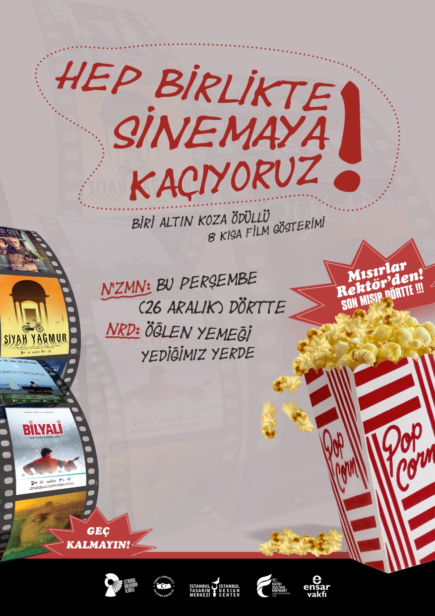 Üniversitemiz ve İstanbul Tasarım Merkezi işbirliği ile düzenlenecek olan ‘’Biri Altın Koza Ödüllü 8 Kısa Film Gösterimi’’ 26.12.2013 Perşembe günü saat 16:00’da Haliç Yerleşkesi Konferans salonunda (yemekhane) gerçekleştirilecektir.