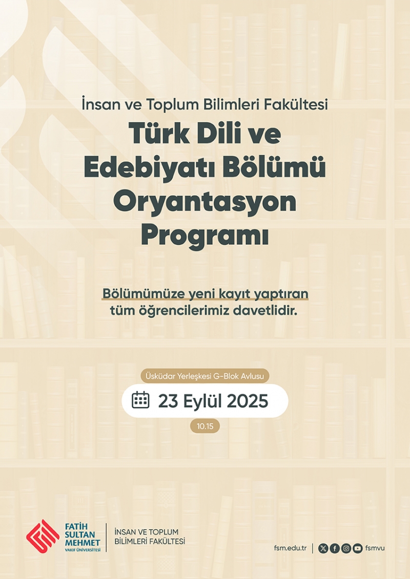 23 Eylül 2025 günü saat 10.15'te G blok avlusunda Türk Dili ve Edebiyatı Bölümü oryantasyon toplantısı düzenlenecektir. Tüm birinci sınıf öğrencilerimiz davetlidir!