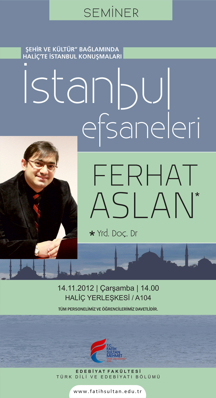 Şehir Ve Kültür Bağlamında Haliç'te İstanbul Konuşmaları:İstanbul Efsaneleri Semineri", Haliç Yerleşkemizde 14 Kasım 2012 Çarşamba Günü Saat: 14.00'de Üniversitemiz Edebiyat Fakültesi Türk Dili ve Edebiyatı Bölümü tarafından Yrd. Doç. Dr Ferhat Aslan'ın katılımıyla gerçekleştirilecektir.
