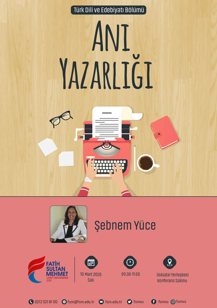 Türk Dili ve Edebiyatı Bölümü'nün düzenleyeceği "Anı Yazarlığı" konferansı, Şebnem YÜCE tarafından 10 Mart 2020 Salı günü saat 09:30'da Üsküdar Yerleşkesi Konferans Salonunda gerçekleşecektir.