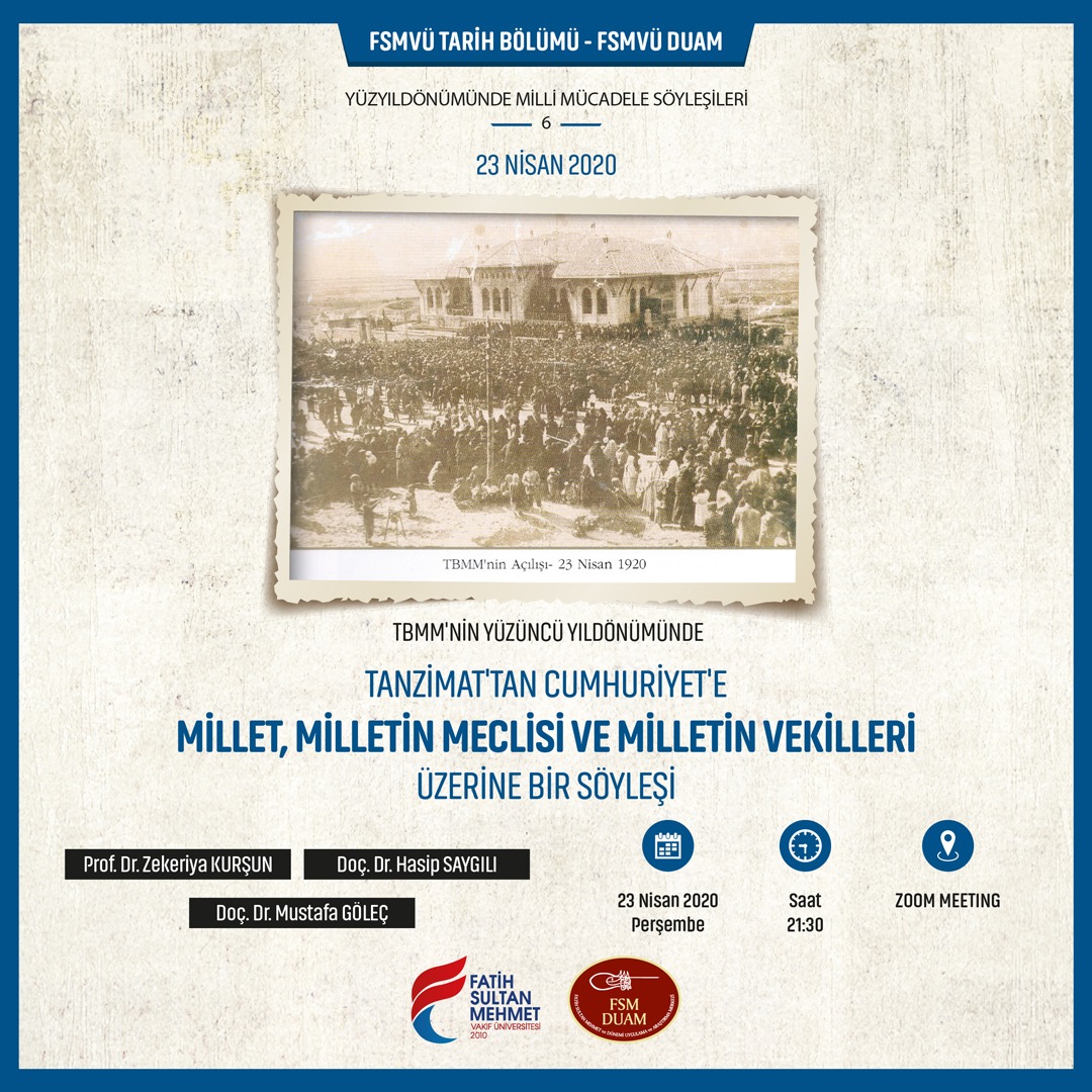 Tarih Bölümü’nün düzenlediği Yüzyıldönümünde Milli Mücadele Söyleşileri online ortama taşındı. Tarih Bölümü Öğretim Üyeleri Prof. Dr. Zekeriya KURŞUN, Doç. Dr. Hasip SAYGILI ve Doç. Dr. Mustafa GÖLEÇ “TBMM’nin Yüzüncü Yıldönümünde Tanzimat’tan Cumhuriyet’e Millet, Milletin Meclisi ve Milletin Vekilleri Üzerine Bir Söyleşi” başlığıyla Zoom’da canlı yayında olacak.